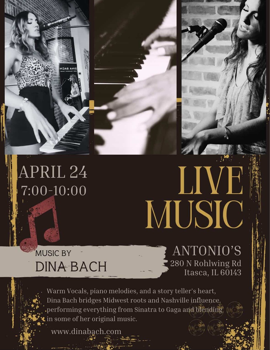Friday, April 24. pair your favorite Italian dish and the worm vocals of Dina Bach performing from Sinatra to Gaga. Enjoy your evening with your friends & family or make the perfect fist date dinner accompanied by Dinas piano melodies!