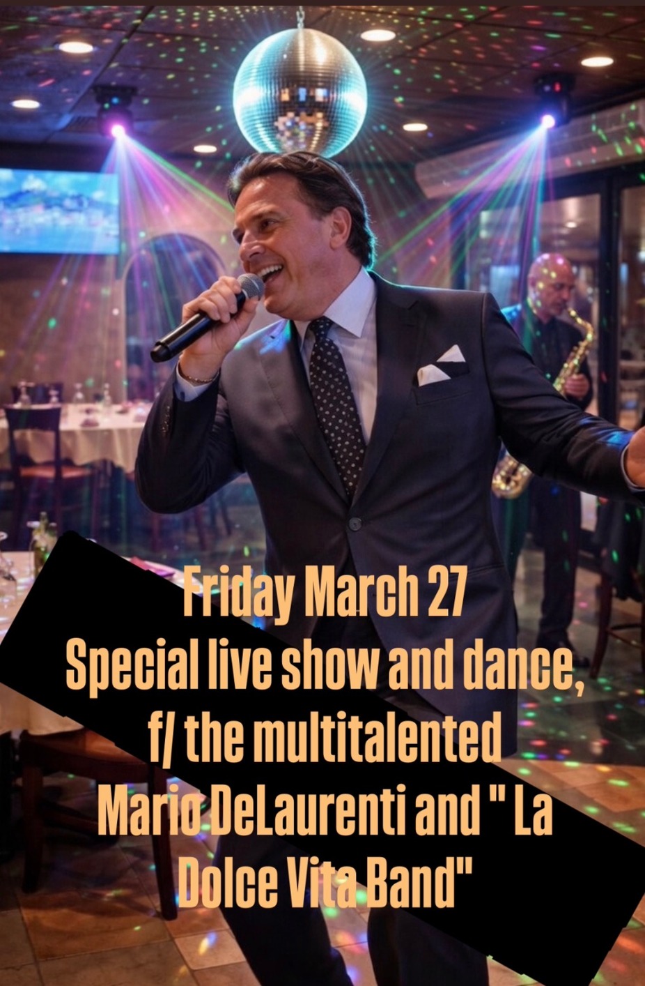 " Special live show and dance for one night only" Italian American musician Vocalist Extraordinaire Multitalented "Mario DeLaurenti and La Dolce Vita Band"
